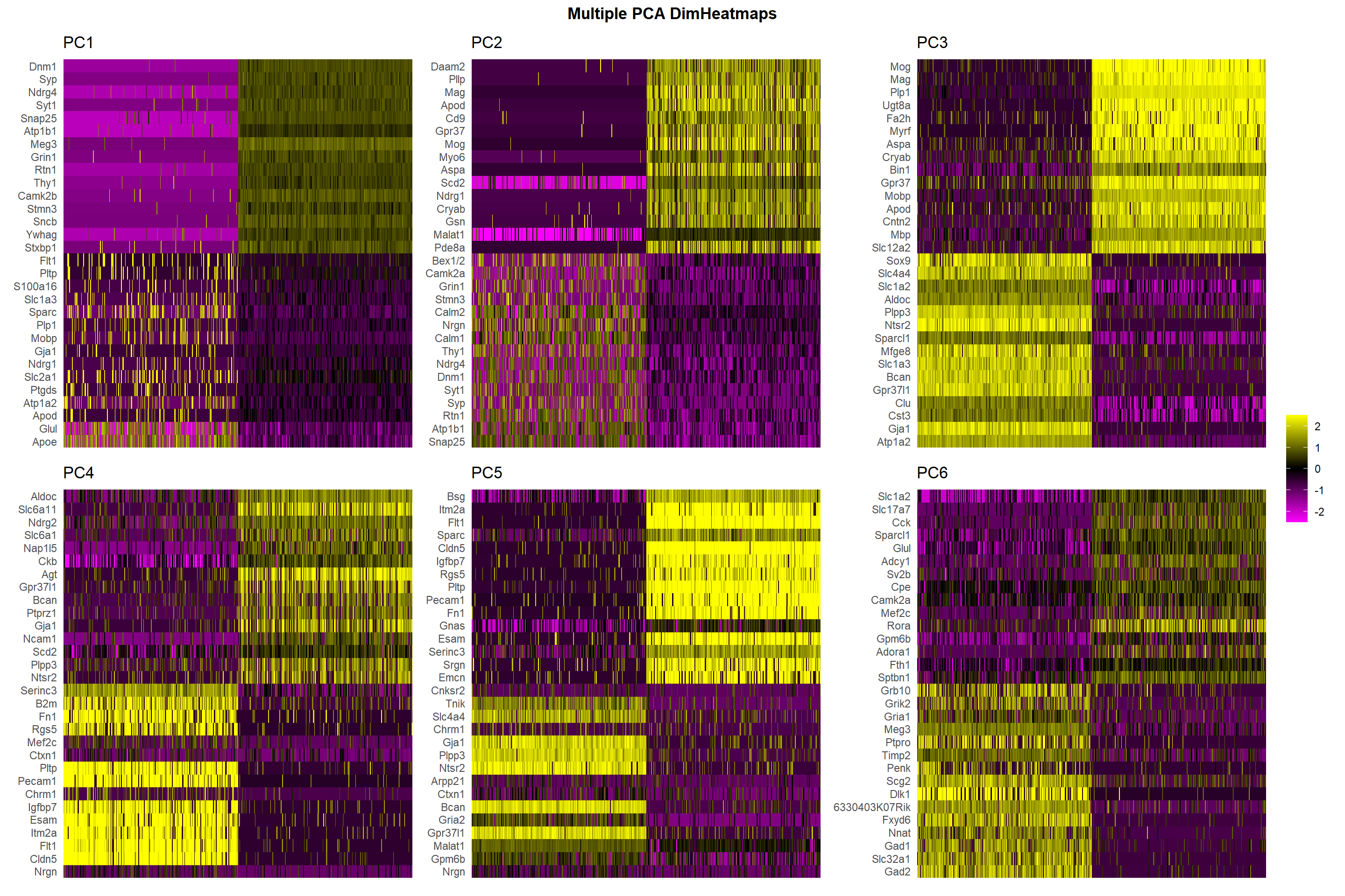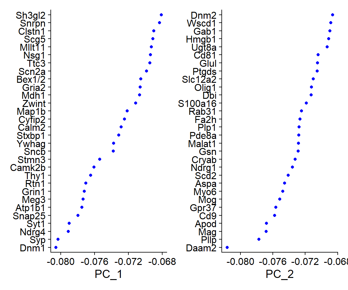 The loadings for each PC show which genes are driving the variance in the data along that axis. In this case, for example, cells with a high score for PC 1 would have a higher expression of genes like Apoe, Glul, Apod, Atp1a2, Ptgds, while cells with a lower score for PC 1, would instead have higher expression of genes like Dnm1, Syp, Ndrg4, Syt1, Snap25.